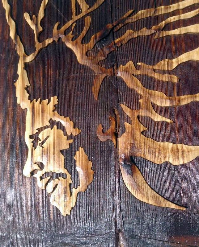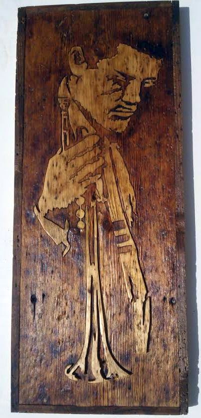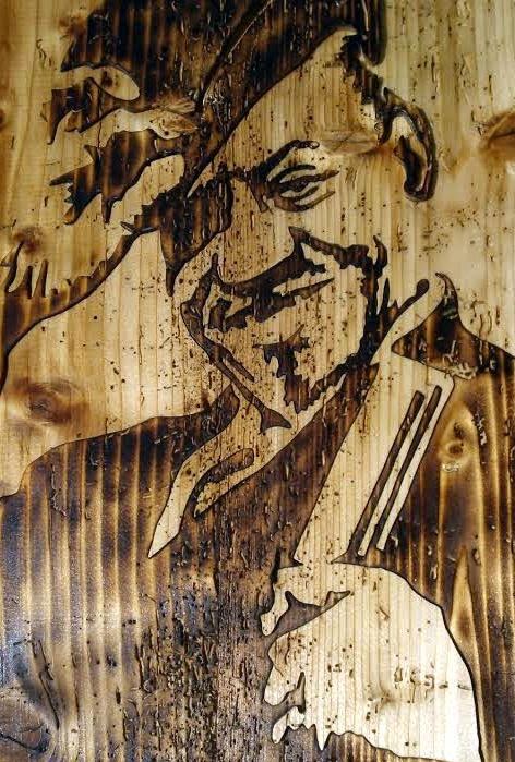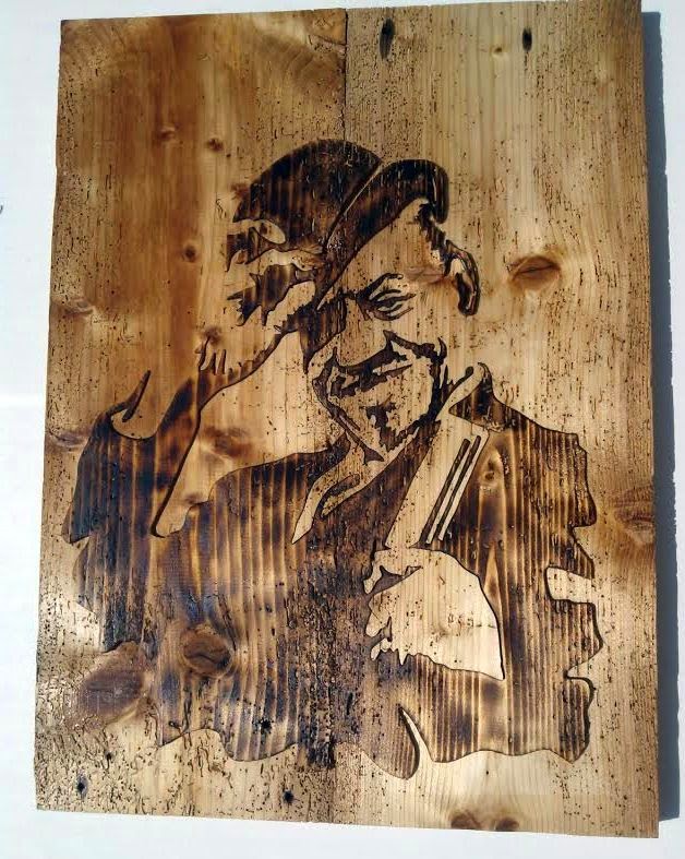 INTARSIO A LAMELLE.amaranto,legno serpente,noce,acero,palissandro. JIM MORRISON-intarsio a lamelle su asse di pino BENIT...